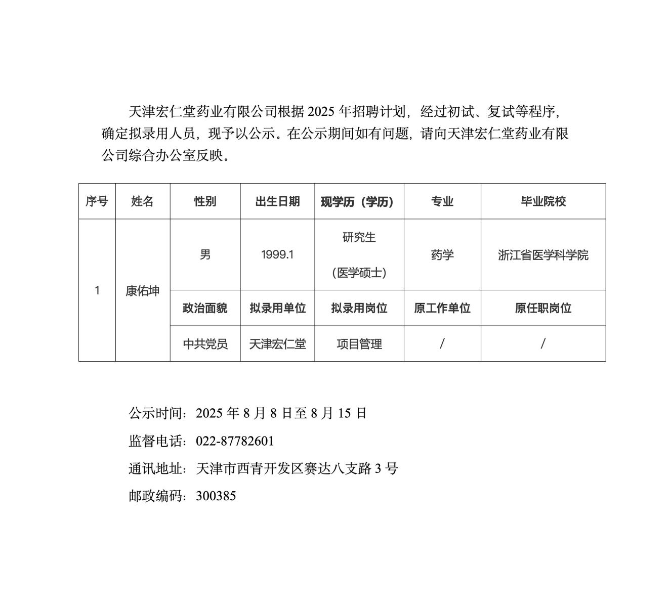 天津宏仁堂藥業(yè)有限公司擬錄用2025年校招人員公示信息